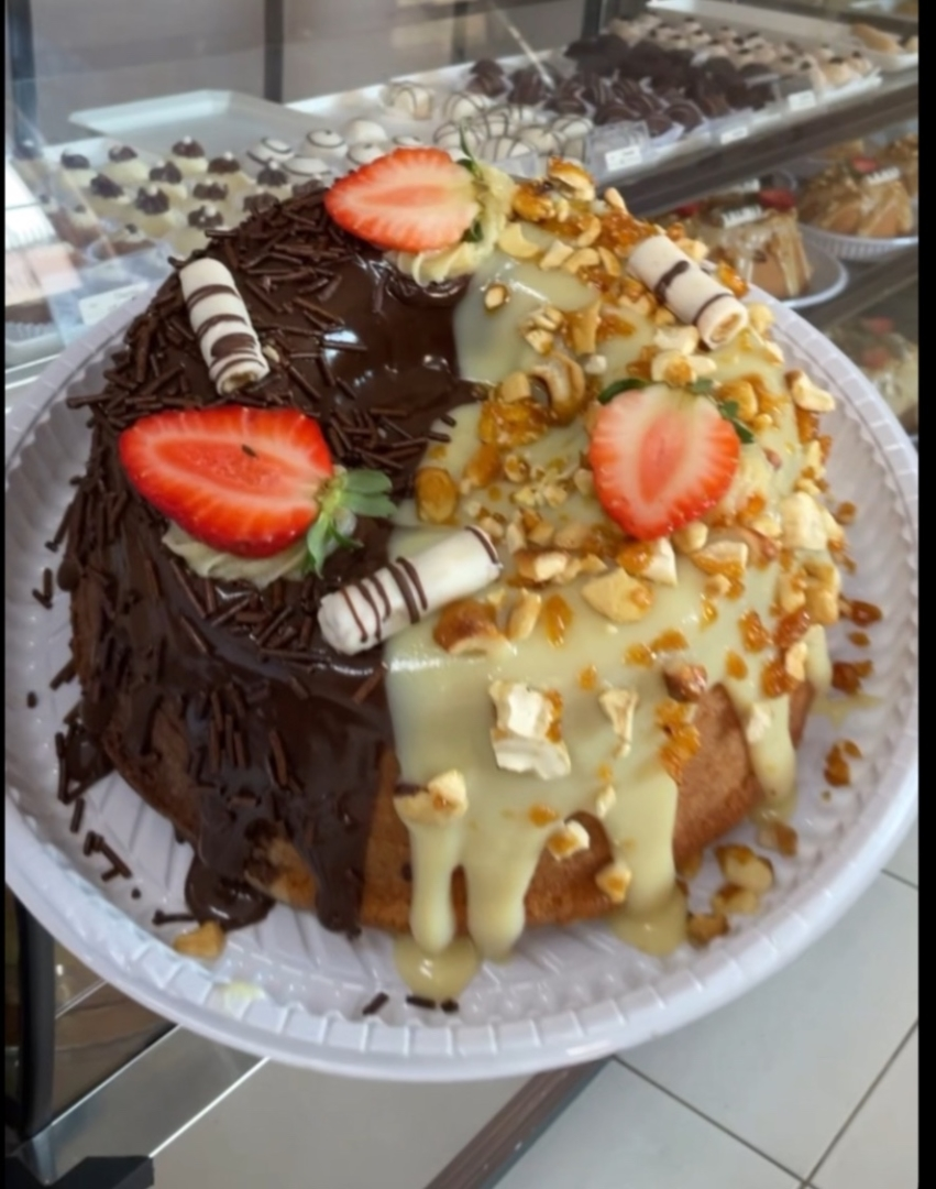 MASSA DO BOLO AMANTEIGADO TRADICIONAL, 1 RECHEIO CROCANTE, COBERTURA: LEITE CONDENSADO E FRUTAS PARA DECORAR( FRUTAS PODEM VARIAR DE ACORDO COM DISPONIBILIDADE ) lAÇO DOURADO OU BRANCO, CASO QUEIRA OUTRO PODE COLOCAR EM OBSERVAÇOES.
